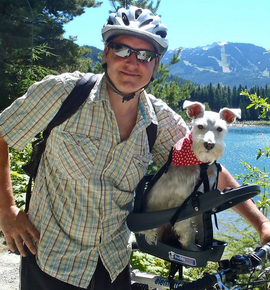 "Just wanted to drop a line to say how much Zander and I enjoy the Buddyrider. It's PERFECT!--I had tried a trailer, basket in the back, and basket on the handlebars. They all had some major disadvantage for Zander or for me (he weighs 18 pounds). I retain good weight distribution and handlebar use with the Buddyrider." - Karen E