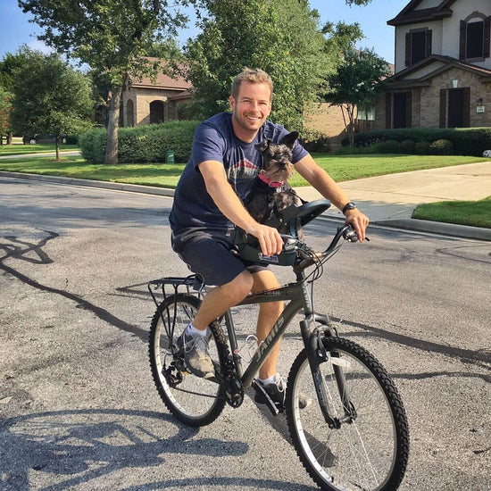 3) To get your buddy ready for their first ride, we recommend getting them comfortable in the seat while it is on the ground. Have a few treats ready to help encourage them if they’re hesitant. Once you and your dog are ready, attach the Buddyrider to your bike. Put your dog in and walk your bike to get them used to the idea, praising them along the way.