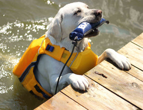 The Monterey Bay Offshore life jacket has two sturdy grab handles (M, L, XL only - smaller sizes have one) to make it easier to get your dog out of the water. This feature allows you to lift your dog up with two hands and pull them back up so it is great for large, heavy dogs. If you have ever tried to pull a large dog back into your boat without a life jacket, you will very much appreciate this feature. The material of the dog safety vest is saltwater-resistant and has a D-ring for attaching a leash. Additionally, it has reflective piping for improved visibility at night, and it is super adjustable to fit any size or shape of dog. Available in nautical yellow, as well as blaze orange, and it comes in five different sizes.